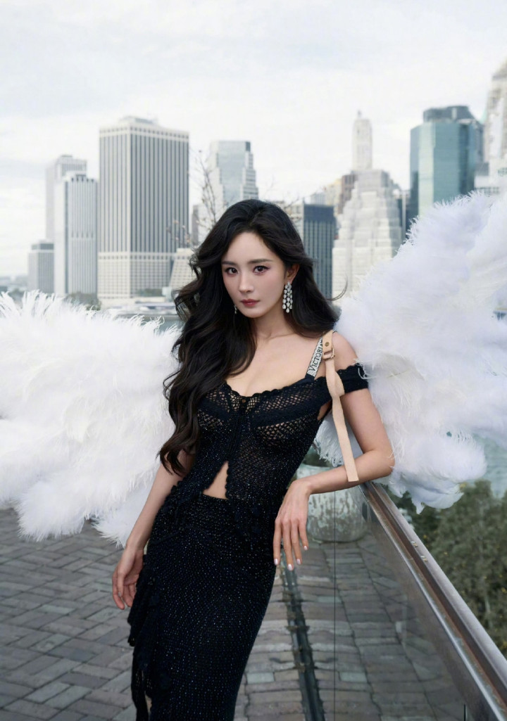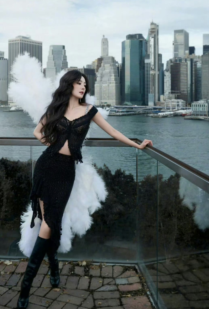 维密时隔多年重启大秀,作为亚太区首位代言人,杨幂的粉毯造型被视为品牌“重返巅峰”的关键一环。而她此次选择的黑色深V礼服,既保留了维密标志性的性感元素,又通过腰间镂空设计与金属链条装饰,融入了东方摩登感。最吸睛的当属背后的“羽翼翅膀”——羽毛渐变从香槟金到银白,搭配她卷发侧分的慵懒造型,瞬间让人联想到2015年她录制《快乐大本营》时的经典造型。十年过去,美貌与气场却仿佛按下了暂停键。